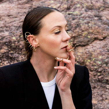 The Mythos collection is inspired by a statue of the Aztec creator god, Quetzalcoatl - a half snake, half feather covered God that Nina saw in the Museum of Anthropology in Mexico City. As feathered serpent deity, he symbolizes opposites, melting together. The destructive and developing earthly characteristics, represented by the snake, with the fertile and rendering forces of the heavens, represented by the bird. This duality is seen across cultures, in Greek mythology as Medusa the Gorgon with snakes for hair and in ancient Egypt, Wadjet, the winged serpent, protected the Pharaohs and controlled the waters of the Nile. This collection celebrates that polarity, remembering that we are not defined by just one characteristic, instead we are multidimensional people, finding a way to make our opposing attributes live in harmony.