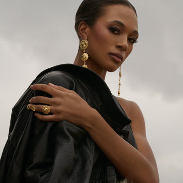The Fortuna collection is inspired by the Roman God of luck. This collection is made to be modern talismans that will bring you good fortune when you wear them. Fortuna is always portrayed with a cloth covering their eyes, a reminder to ancient Romans that fortune is truly blind. The symbolism brought hope to the lower class, knowing that money or power could not sway luck.