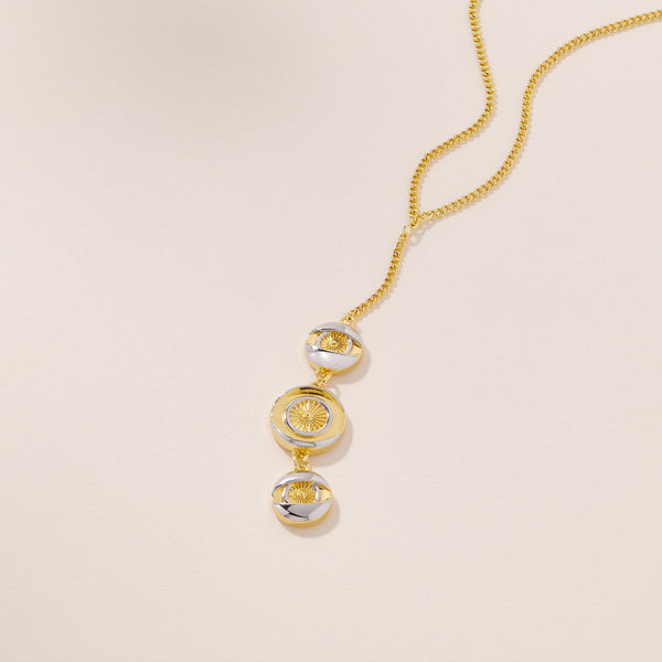Three evil eye charms are linked together to make a dangly lariat necklace with the 3rd eye motif.