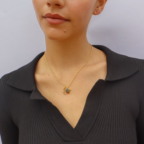 A hammered crescent moon & shimmering faceted labradorite star on a 16 inch chain with 3 inch extender.