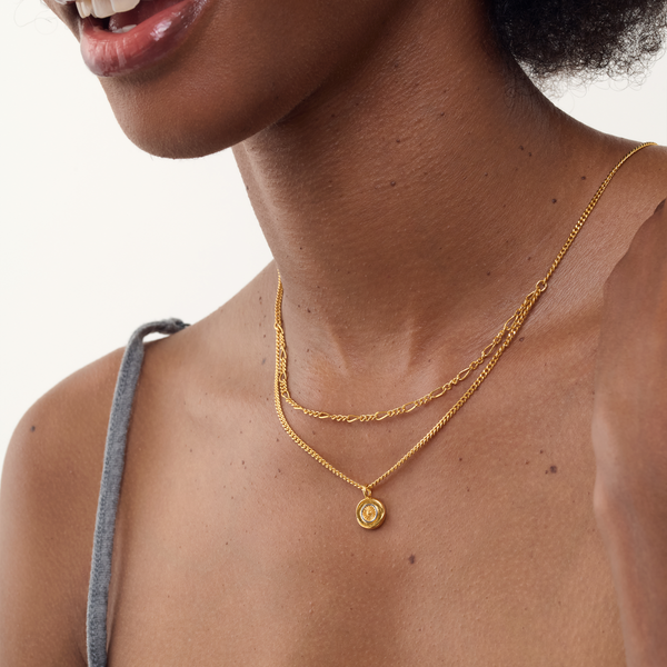 This tiny Evil eye charm is attached to 2 of our most popular chains (the Rebel and the Warrior). It creates a stacked look with just one piece & has a toggle clasp so you can put it on easily. The toggle can be moved to make it a choker or a lower necklace based on your style.