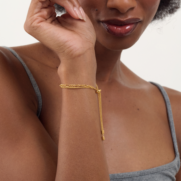 This tiny Evil eye charm bracelet is attached to 2 of our most popular chains (the Rebel and the Warrior). It creates a stacked look with just one piece & has a toggle clasp so you can put it on easily and it fits to any wrist.