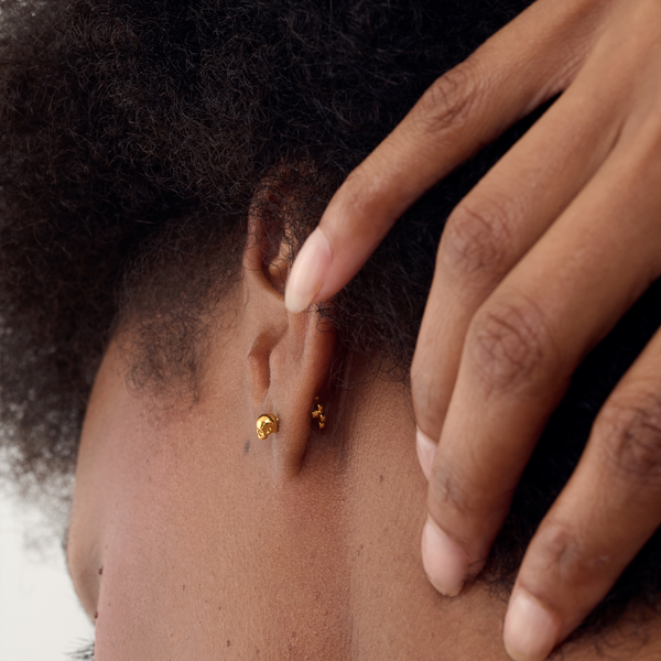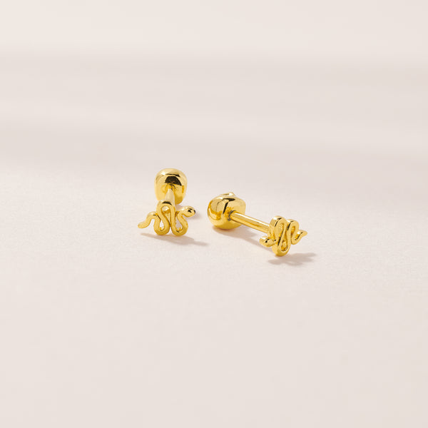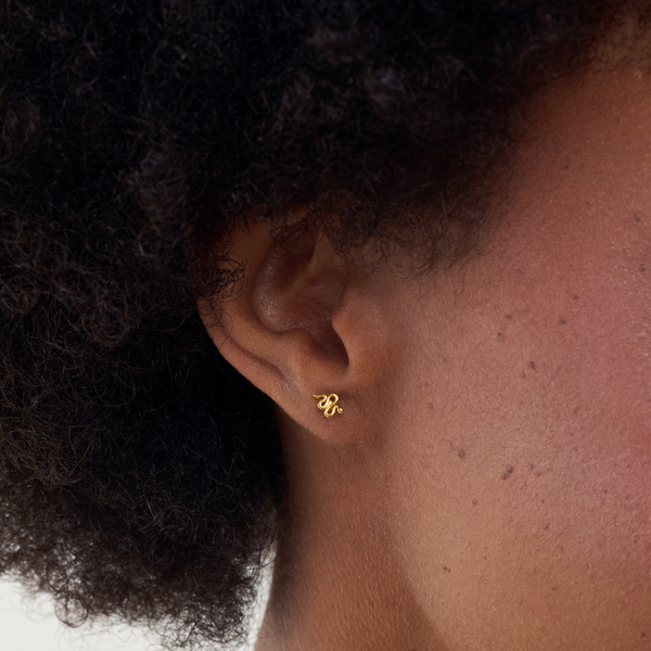 The cutest little tiny studs but make it double! These Serpent and Skull earrings have the comfort of a flat back and you can easily screw the tops to choose which side you'd like on the front of the ear. The best part is the added design that sits at the back of your ear and creates a whole second ear styling moment.
