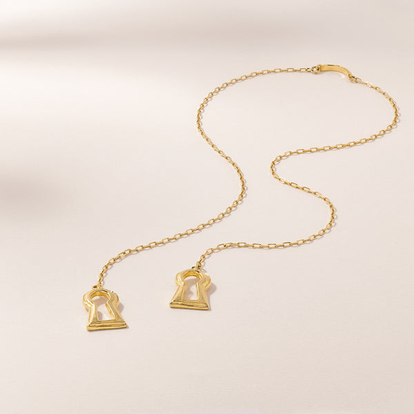 No piercings needed to attach this gorgeous face piece. The keyholes dangle behind the ears creating the look of earrings and the chain hugs the face beautifully. The Vessel face piece features two open keyholes that were cast from a vintage doorway in France.